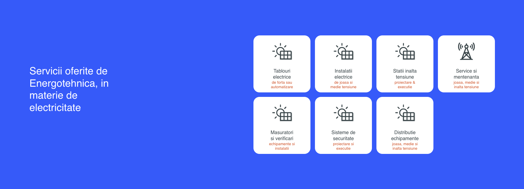 Lucrări de joasă și medie tensiune și servicii de mentenanță a lucrărilor, pentru a menține sistemele în stare optimă de funcționare. De asemenea suntem specializați în lucrări în stații de transformare, dezvoltarea parcurilor fotovoltaice și implementarea sistemelor de securitate și antiefracție, oferind soluții complete și fiabile pentru toate nevoile clienților nostri.